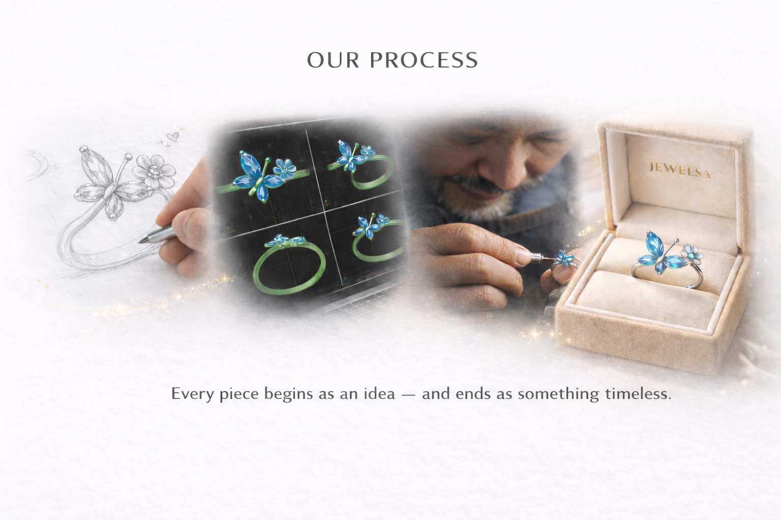 Every piece of jewellery begins as a thought — a quiet idea shaped by inspiration, refined by design, and brought to life through skilled craftsmanship. At our core, we believe jewellery is not just an ornament, but an expression of emotion, individuality, and timeless beauty.Our journey starts with hand-drawn sketches, where creativity flows freely. These ideas are then perfected using precise CAD design, ensuring balance, comfort, and accuracy in every detail. From there, skilled karigars carefully shape each piece by hand, honoring traditional techniques while maintaining modern standards of quality.Each creation goes through thoughtful finishing and quality checks before it reaches you — polished, refined, and ready to be cherished. We focus on clean design, honest craftsmanship, and lasting elegance, creating jewellery that feels personal and meaningful.This is our story — one of patience, precision, and passion — crafted for those who value beauty that endures.